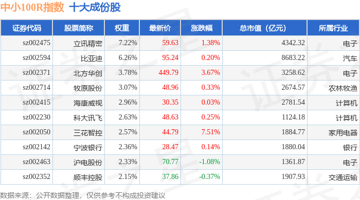 证券之星消息,12月4日,中小100R(399333)指数报收于9641.75点,涨0.26%,成交865.54亿元,换手率1.02%。当日该指数成份股中,上涨的有44家,三花智控以7.51%的涨幅领涨,下跌的有52家,东山精密以4.56%的跌幅领跌。