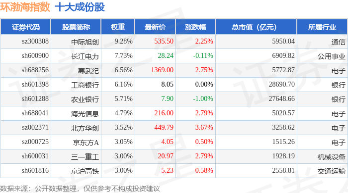 证券之星消息,12月4日,环渤海(399357)指数报收于3578.51点,涨0.61%,成交614.51亿元,换手率0.22%。当日该指数成份股中,上涨的有19家,北方华创以3.67%的涨幅领涨,下跌的有18家,恒力石化以2.6%的跌幅领跌。