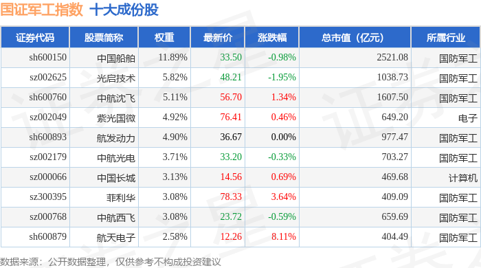 国证军工(399368)指数十大成份股详情如下: