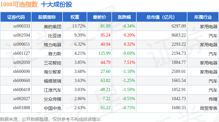 证券之星消息,12月4日,1000可选(399384)指数报收于4108.51点,涨0.1%,成交630.55亿元,换手率1.43%。当日该指数成份股中,上涨的有33家,三花智控以7.51%的涨幅领涨,下跌的有55家,无线传媒以5.12%的跌幅领跌。