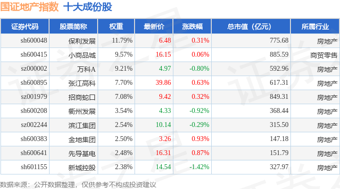 国证地产(399393)指数十大成份股详情如下: