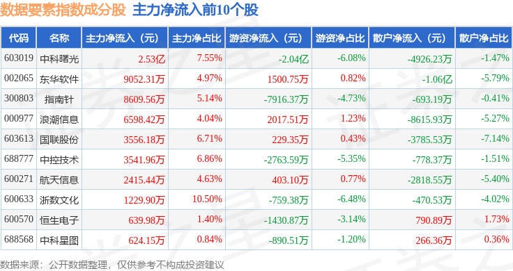 资金流向方面,数据要素(399418)指数成份股当日主力资金净流出合计7.31亿元,游资资金净流入合计3.4亿元,散户资金净流入合计3.91亿元。成份股资金流向详情见下表:
