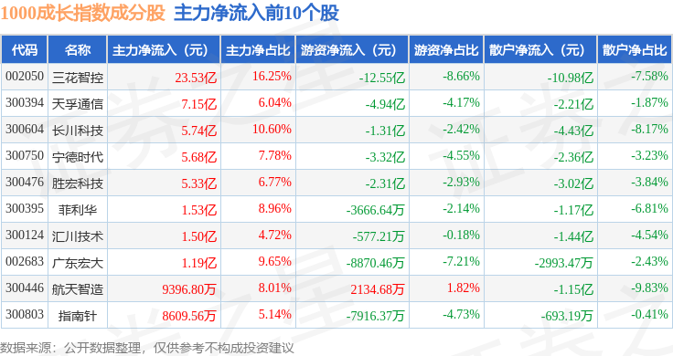 资金流向方面,1000成长(399630)指数成份股当日主力资金净流出合计42.88亿元,游资资金净流出合计15.51亿元,散户资金净流入合计58.39亿元。成份股资金流向详情见下表: