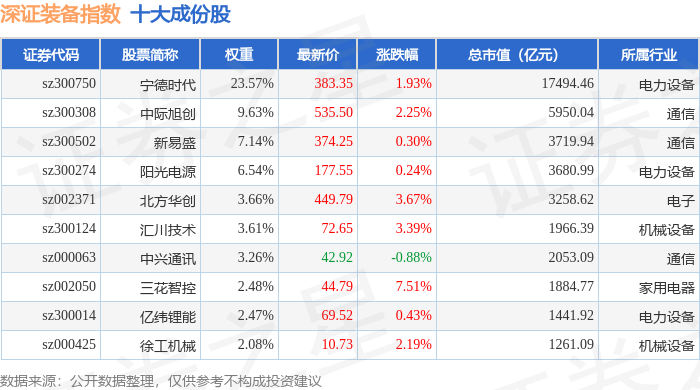 深证装备(399636)指数十大成份股详情如下:
