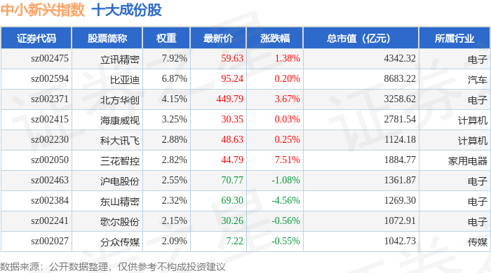 证券之星消息,12月4日,中小新兴(399642)指数报收于2236.34点,涨0.46%,成交1001.24亿元,换手率1.52%。当日该指数成份股中,上涨的有47家,和而泰以10.01%的涨幅领涨,下跌的有50家,东山精密以4.56%的跌幅领跌。