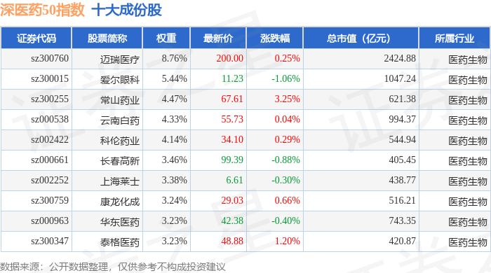 证券之星消息,12月4日,深医药50(399647)指数报收于8130.45点,涨0.07%,成交125.59亿元,换手率0.96%。当日该指数成份股中,上涨的有21家,信立泰以3.4%的涨幅领涨,下跌的有28家,华兰疫苗以5.75%的跌幅领跌。
