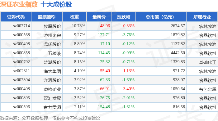 证券之星消息,12月4日,深证农业(399669)指数报收于8391.99点,跌0.83%,成交177.35亿元,换手率1.01%。当日该指数成份股中,上涨的有10家,藏格矿业以3.4%的涨幅领涨,下跌的有40家,泸州老窖以3.76%的跌幅领跌。