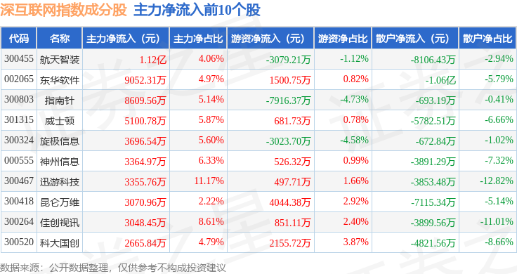 资金流向方面,深互联网(399675)指数成份股当日主力资金净流出合计14.32亿元,游资资金净流入合计1791.41万元,散户资金净流入合计14.14亿元。成份股资金流向详情见下表: