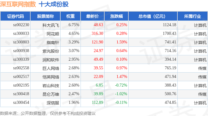深互联网(399675)指数十大成份股详情如下: