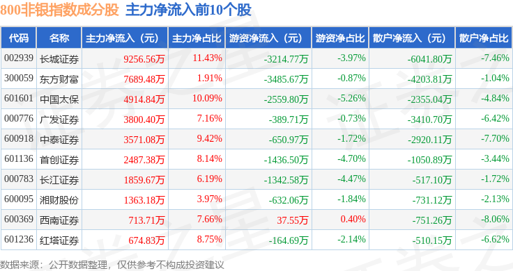 资金流向方面,800非银(399966)指数成份股当日主力资金净流出合计2.99亿元,游资资金净流入合计2162.18万元,散户资金净流入合计2.77亿元。成份股资金流向详情见下表: