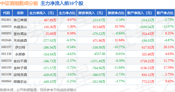 资金流向方面,中证酒(399987)指数成份股当日主力资金净流出合计20.2亿元,游资资金净流入合计5.28亿元,散户资金净流入合计14.92亿元。成份股资金流向详情见下表: