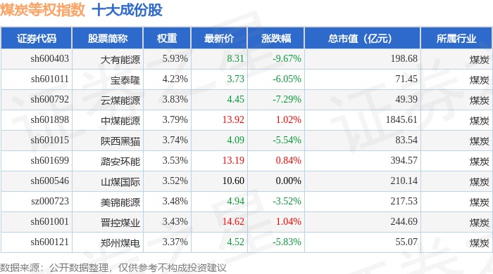 煤炭等权(399990)指数十大成份股详情如下:
