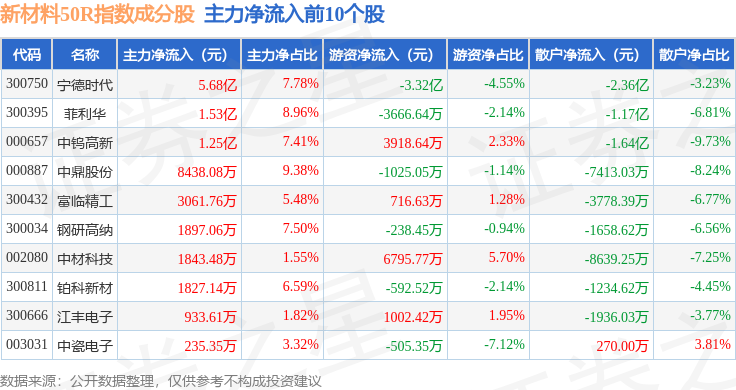 资金流向方面,新材料50R(470042)指数成份股当日主力资金净流出合计9.27亿元,游资资金净流出合计2.2亿元,散户资金净流入合计11.47亿元。成份股资金流向详情见下表: