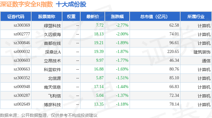 资金流向方面,深证数字安全R(470052)指数成份股当日主力资金净流出合计1.14亿元,游资资金净流出合计7253.25万元,散户资金净流入合计1.86亿元。成份股资金流向详情见下表: