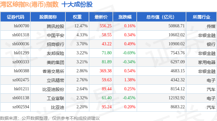 湾区综指R(港币)(480004)指数十大成份股详情如下: