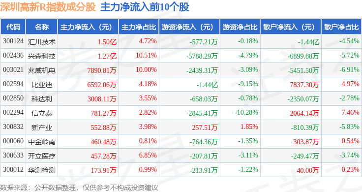 资金流向方面,深圳高新R(480038)指数成份股当日主力资金净流出合计19.19亿元,游资资金净流入合计3.25亿元,散户资金净流入合计15.94亿元。成份股资金流向详情见下表: