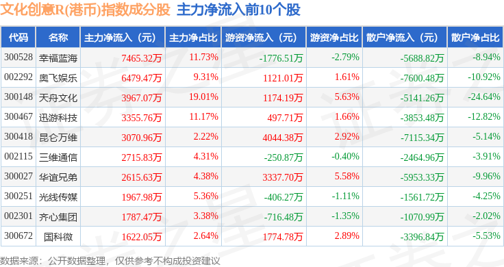 资金流向方面,文化创意R(港币)(480047)指数成份股当日主力资金净流出合计17.93亿元,游资资金净流入合计3.38亿元,散户资金净流入合计14.55亿元。成份股资金流向详情见下表: