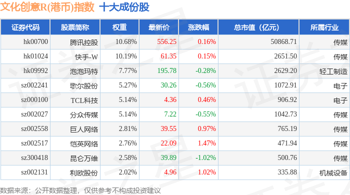 文化创意R(港币)(480047)指数十大成份股详情如下: