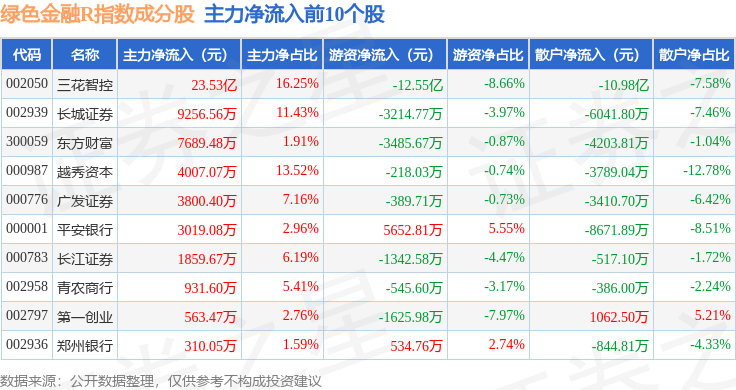 资金流向方面,绿色金融R(480052)指数成份股当日主力资金净流入合计25.65亿元,游资资金净流出合计13.01亿元,散户资金净流出合计12.64亿元。成份股资金流向详情见下表: