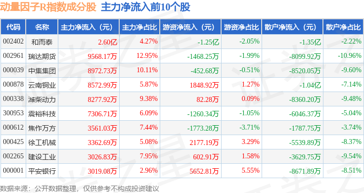 资金流向方面,动量因子R(480057)指数成份股当日主力资金净流出合计2.06亿元,游资资金净流出合计2.45亿元,散户资金净流入合计4.52亿元。成份股资金流向详情见下表: