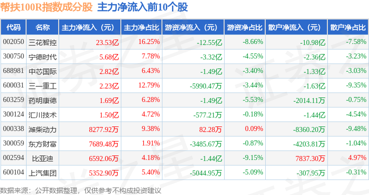 资金流向方面,帮扶100R(480065)指数成份股当日主力资金净流出合计28.39亿元,游资资金净流出合计1254.36万元,散户资金净流入合计28.52亿元。成份股资金流向详情见下表: