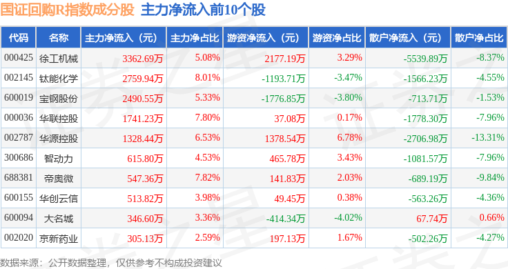 资金流向方面,国证回购R(480063)指数成份股当日主力资金净流出合计3.23亿元,游资资金净流入合计7729.67万元,散户资金净流入合计2.46亿元。成份股资金流向详情见下表:
