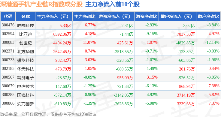资金流向方面,深港通手机产业链R(483009)指数成份股当日主力资金净流出合计16.46亿元,游资资金净流出合计3.13亿元,散户资金净流入合计19.59亿元。成份股资金流向详情见下表: