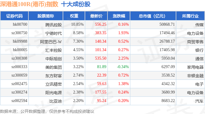 深港通100R(港币)(483008)指数十大成份股详情如下: