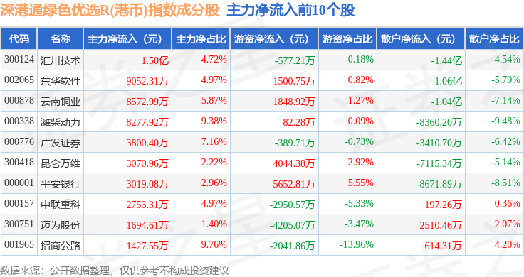 资金流向方面,深港通绿色优选R(港币)(483012)指数成份股当日主力资金净流出合计20.19亿元,游资资金净流入合计1.76亿元,散户资金净流入合计18.43亿元。成份股资金流向详情见下表: