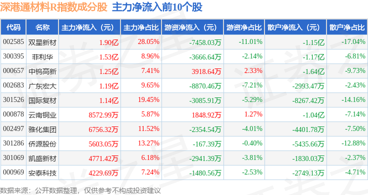 资金流向方面,深港通材料R(483015)指数成份股当日主力资金净流出合计38.49亿元,游资资金净流入合计2.55亿元,散户资金净流入合计35.94亿元。成份股资金流向详情见下表: