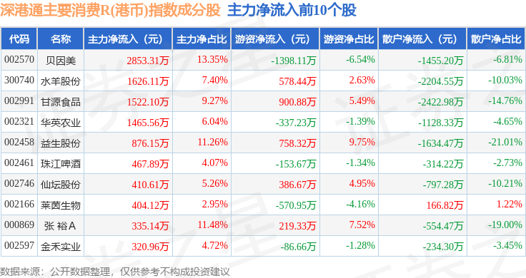 资金流向方面,深港通主要消费R(港币)(483022)指数成份股当日主力资金净流出合计21.25亿元,游资资金净流入合计4.3亿元,散户资金净流入合计16.95亿元。成份股资金流向详情见下表: