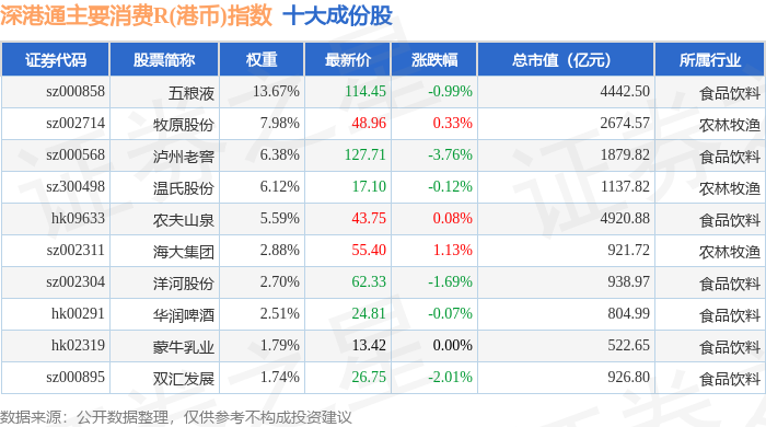 深港通主要消费R(港币)(483022)指数十大成份股详情如下: