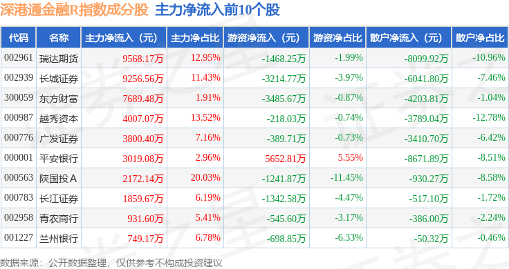 资金流向方面,深港通金融R(483025)指数成份股当日主力资金净流入合计1.47亿元,游资资金净流入合计152.25万元,散户资金净流出合计1.48亿元。成份股资金流向详情见下表: