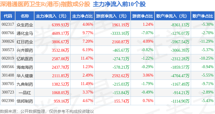 资金流向方面,深港通医药卫生R(港币)(483024)指数成份股当日主力资金净流出合计14.54亿元,游资资金净流入合计3765.82万元,散户资金净流入合计14.16亿元。成份股资金流向详情见下表: