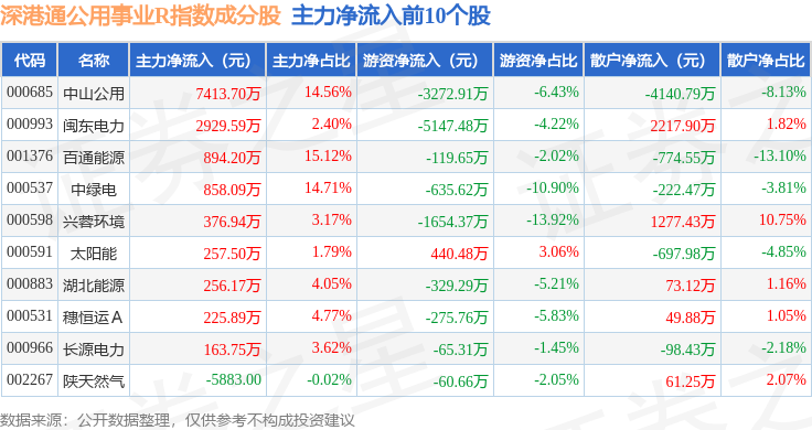资金流向方面,深港通公用事业R(483031)指数成份股当日主力资金净流出合计1.08亿元,游资资金净流出合计1.17亿元,散户资金净流入合计2.25亿元。成份股资金流向详情见下表: