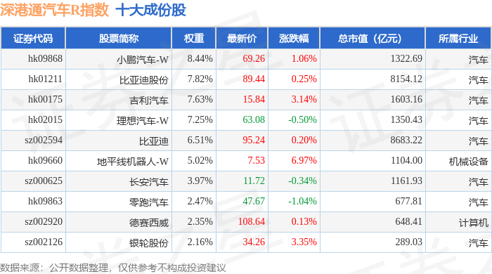 深港通汽车R(483039)指数十大成份股详情如下: