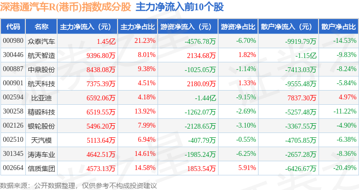 资金流向方面,深港通汽车R(港币)(483040)指数成份股当日主力资金净流入合计1.04亿元,游资资金净流出合计2730.66万元,散户资金净流出合计7654.3万元。成份股资金流向详情见下表: