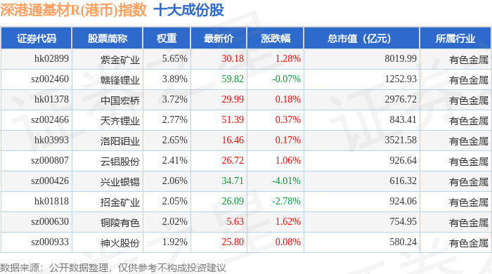 深港通基材R(港币)(483062)指数十大成份股详情如下: