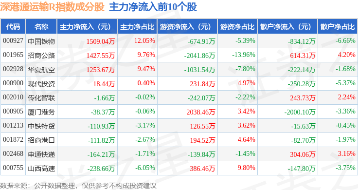资金流向方面,深港通运输R(483077)指数成份股当日主力资金净流出合计1.69亿元,游资资金净流出合计1146.51万元,散户资金净流入合计1.81亿元。成份股资金流向详情见下表:
