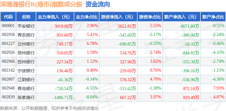 资金流向方面,深港通银行R(港币)(483082)指数成份股当日主力资金净流入合计3125.1万元,游资资金净流入合计6624.67万元,散户资金净流出合计9749.77万元。成份股资金流向详情见下表: