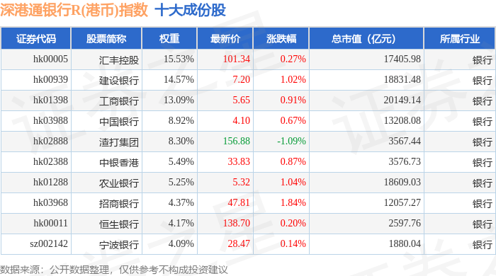 深港通银行R(港币)(483082)指数十大成份股详情如下: