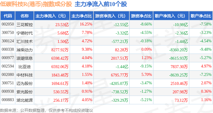 资金流向方面,低碳科技R(港币)(483161)指数成份股当日主力资金净流入合计12.6亿元,游资资金净流出合计18.83亿元,散户资金净流入合计6.24亿元。成份股资金流向详情见下表: