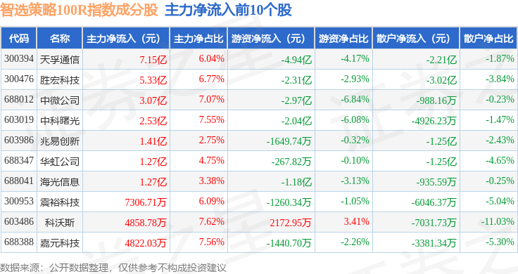 资金流向方面,智选策略100R(489015)指数成份股当日主力资金净流出合计28.2亿元,游资资金净流出合计2.89亿元,散户资金净流入合计31.09亿元。成份股资金流向详情见下表: