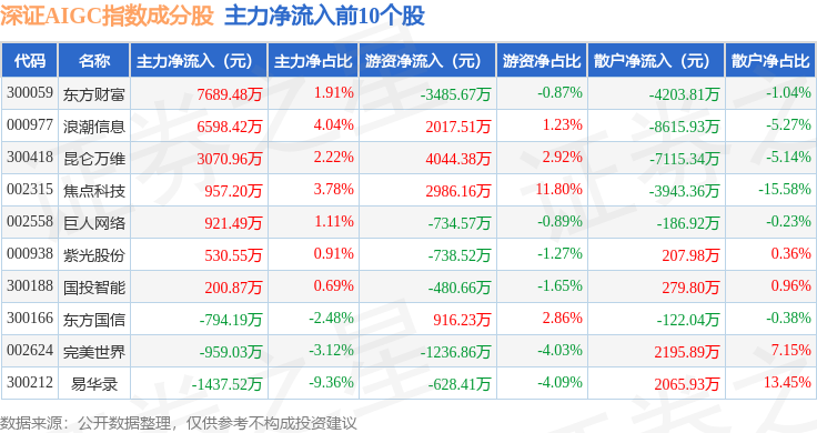 资金流向方面,深证AIGC(970075)指数成份股当日主力资金净流出合计11.1亿元,游资资金净流入合计1.08亿元,散户资金净流入合计10.02亿元。成份股资金流向详情见下表: