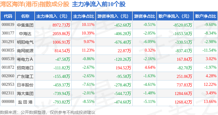 资金流向方面,湾区海洋(港币)(980020)指数成份股当日主力资金净流出合计1.24亿元,游资资金净流入合计344.34万元,散户资金净流入合计1.21亿元。成份股资金流向详情见下表: