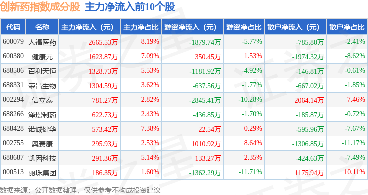 资金流向方面,创新药(980086)指数成份股当日主力资金净流出合计2.17亿元,游资资金净流入合计4234.38万元,散户资金净流入合计1.74亿元。成份股资金流向详情见下表: