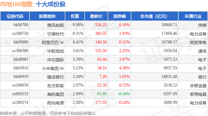 内地100(983001)指数十大成份股详情如下: