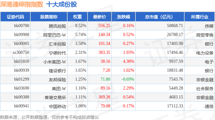 证券之星消息,12月4日,深港通综指(983005)指数报收于6355.58点,涨0.29%,成交7912.83亿元,换手率1.12%。当日该指数成份股中,上涨的有821家,固高科技以19.99%的涨幅领涨,下跌的有1195家,江龙船艇以11.44%的跌幅领跌。