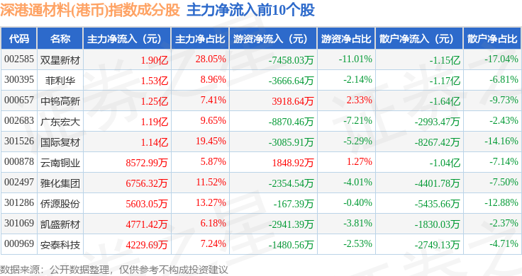 资金流向方面,深港通材料(港币)(983016)指数成份股当日主力资金净流出合计38.49亿元,游资资金净流入合计2.55亿元,散户资金净流入合计35.94亿元。成份股资金流向详情见下表: