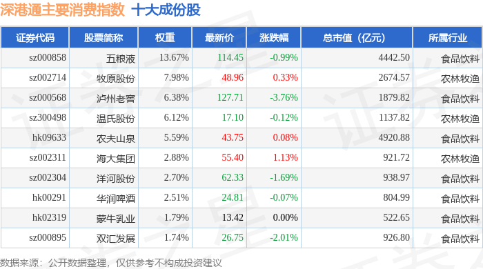 深港通主要消费(983021)指数十大成份股详情如下: